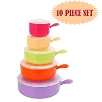 You will love our Microwave, Storage Bowls and Lids. Now you can microwave, serve and store all in the same bowl. The unique vented lids keep food fresh and tasting great. And the handle makes serving and carrying easy. Assorted sized bowls hold from 8 to 32 fl. oz. 10 pc Set. Made for Microwaves and Refrigerating. Sizes include" 3.25' , 3.75", 6.25" , 6" and 7" Diameter Bowls/Pots in Assorted Fun Colors. Set includes 5- Bowl/Pots with 5 Matching Lids. A must have for every kitchen!